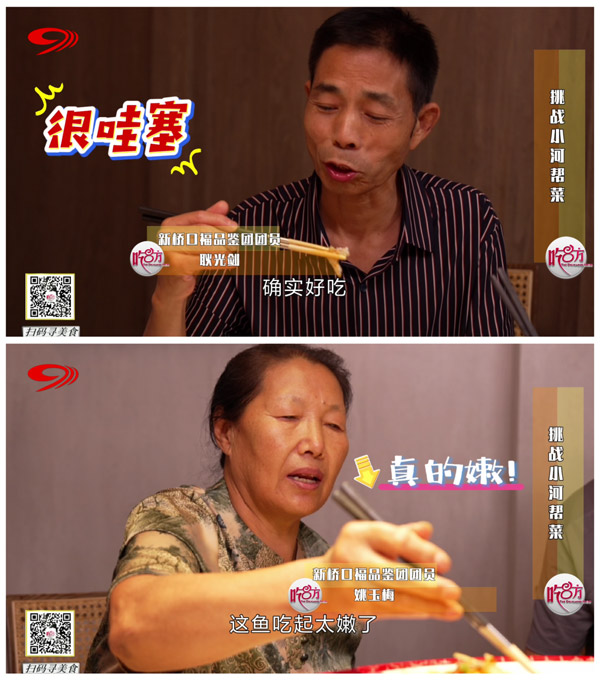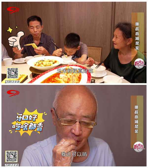 口福挑战第一关,是以“鲜、活、烫、辣”为特色的招牌菜——非遗活渡鱼,“渡水烹饪”的鲜鱼佐以大量青红辣椒与姜丝,端上桌时还冒着热气,非常考验牙齿对烫和辣的忍受力。种好牙后的耿叔叔表示:“确实好吃,鲜、香、嫩!”一口鱼肉入腹,姚阿姨也连连赞道:“这鱼吃起太嫩了!”而姚阿姨的老伴却不禁感叹:“以前(她)没种牙的时候,鱼是想吃不敢吃,但是现在随便吃了!”