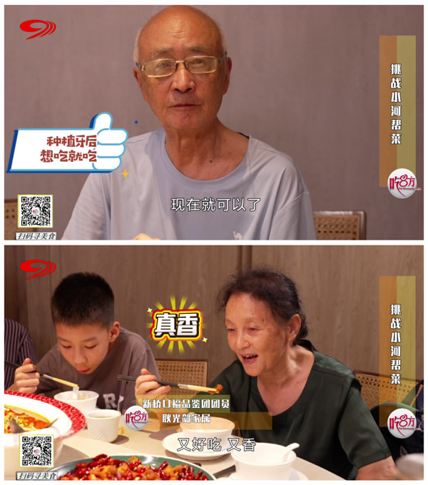 口福挑战第二关,呈上了猛火爆炒、外酥里嫩的辣子鸡,红辣椒与花椒在盘中铺展开来,营造出一种“辣椒里找鸡丁”的视觉冲击,考验牙齿对辣的忍受力。只见拥有一口好牙的付叔叔吃得过瘾、乐得开怀,并表示:“原来没安牙齿、嚼不动,现在就可以了。”而耿叔叔的家人同样在新桥口腔种好了牙,面对这道美食,她表示:“又好吃又香,四川人就喜欢吃辣的。”
