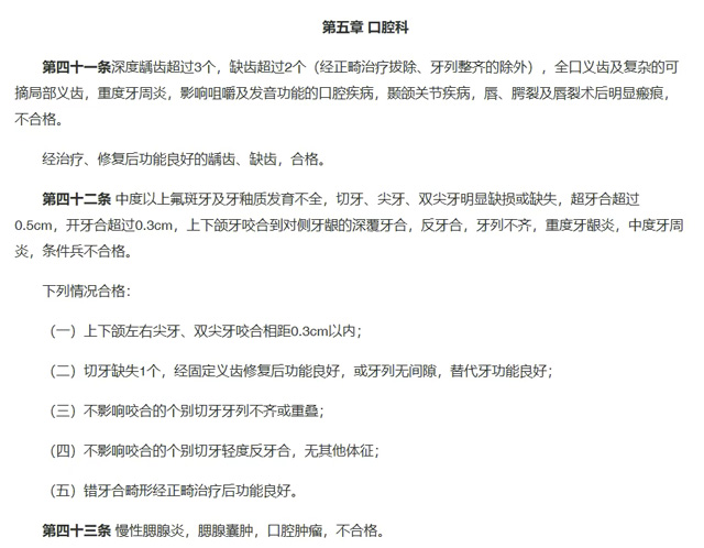 最新征兵体检标准中,对口腔健康有着明确且严格的要求。同时,部分特殊兵种(如潜艇兵、飞行员等)的体检标准里,对口腔健康的要求更加严格:牙列不齐、咬合不良、牙周炎、缺齿等均不合格。