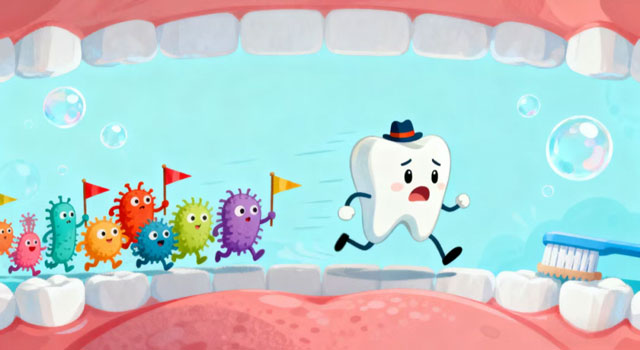 让我们牙齿遭罪的龋病(蛀牙)和牙周病,罪魁祸首都是长期附着在牙齿表面的细菌,它们聚集在一起,就形成了牙菌斑。但牙菌斑并不是一下子就变得“顽固难除”的,它的形成和成熟是一个逐步发展的过程,当刚刷完牙后,便开始有少量松散细菌借助唾液薄膜附着在牙面上;随后细菌数量逐渐增多,附着也更为牢固;12小时后,附着的细菌开始繁殖代谢并形成复杂生物膜结构,菌斑逐渐成熟且难以通过简单刷牙去除;而经过24小时,牙菌斑会完全成熟,形成一个复杂的微生物群落,此时的菌斑对口腔健康威胁很大,容易引发龋齿和牙周疾病。