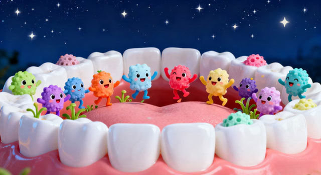 唾液是牙齿的“天然保护盾”:一方面,它能不断冲刷牙齿表面,带走食物残渣,抑制细菌生长;另一方面,唾液里含有的钙、磷等矿物质,能让受损的牙面重新“变硬”(也就是“再矿化”)。但到了晚上,我们睡觉时唾液分泌量会大幅减少,这层“保护盾”就变弱了。细菌失去了唾液的抑制,会趁机大量繁殖,对牙齿的威胁也随之升级。而晚上刷牙,能在唾液减少前,把牙面上的细菌量控制在最低水平,从源头减少细菌“作乱”的可能。