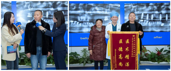 温馨互动环节中,70岁的李先生作为曾接受舒适化半口种植的老顾客,也登台分享了他的感受:“新桥口腔是央企投资的,这点让我很放心。李主任技术很好,真的一点没有感觉到痛,效果非常满意!”随后,李先生和老伴将一面写有“医术精湛·医德高尚”的锦旗亲手赠予李阳军主任,以表达对其医疗团队的深深谢意。从初次体验的认可到长期信赖的回馈,新桥口腔的舒适化技术再次赢得了患者的真情印证。