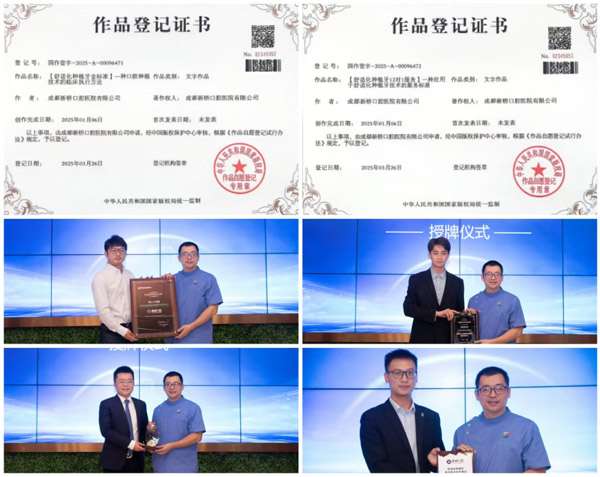 为确保该体系的标准化与高品质,新桥口腔制定并统一执行《舒适化种植牙金标准》与《舒适化种植牙12对1品质服务》标准,且于2025年3月获国家著作权认证。这一系列独家标准也获得瑞士士卓曼、德国贝格等国际知名植体品牌的联合认可,并授予我院舒适化种植临床合作示范基地称号。